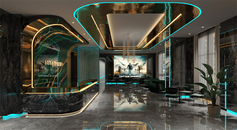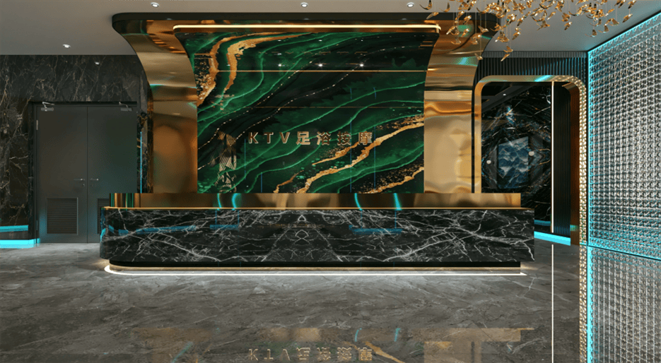 前臺區(qū)域,以黑色大理石搭配金色弧形裝飾,背景墻的綠色紋理石材與金色線條相得益彰,彰顯高端品質(zhì)。大廳中,大型影視屏幕與綠植點綴,營造舒適氛圍。