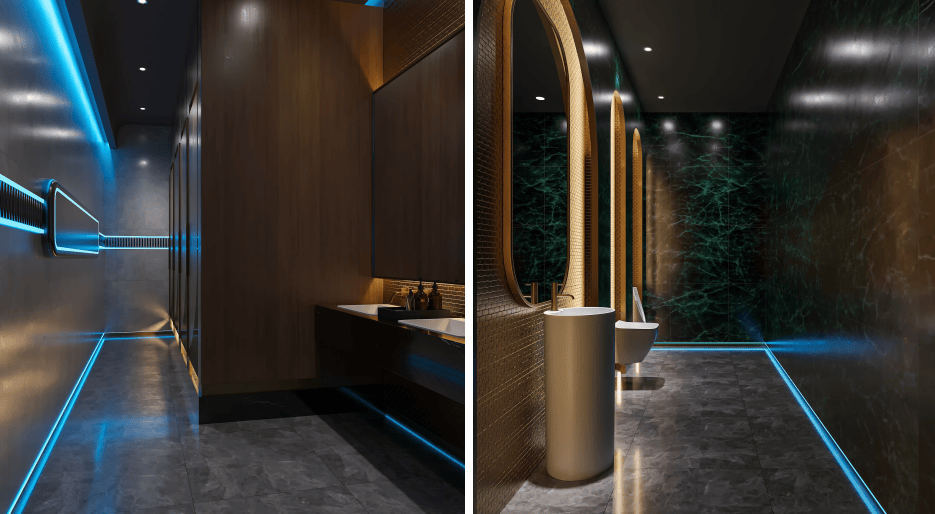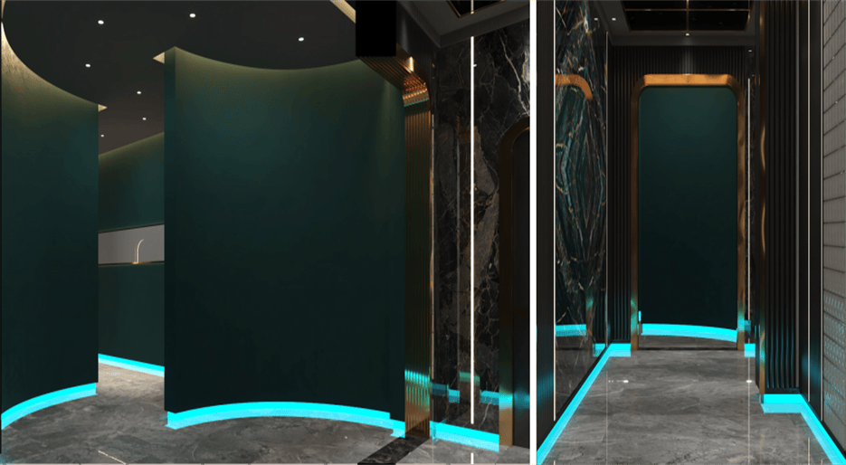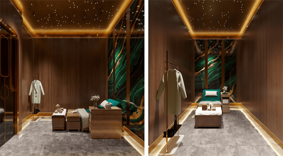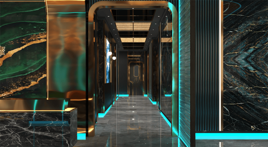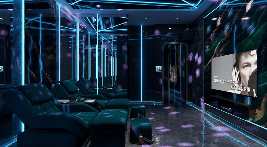 走廊及包間,深色大理石地面搭配藍色燈帶,營造出神秘且時尚的氛圍。包間內(nèi),木質(zhì)墻板搭配綠色石材背景墻,溫馨舒適,星空頂設計增添浪漫情調(diào)。KTV 包間,藍色霓虹燈帶與鏡面材質(zhì)結合,打造出炫酷的視聽空間,舒適的沙發(fā)座椅提升顧客體驗,整體設計旨在為顧客提供一個集休閑、娛樂、放松于一體的高品質(zhì)場所。