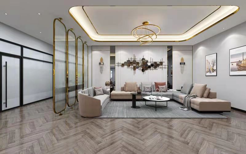 會(huì)客區(qū),沙發(fā)組合舒適,裝飾畫與吊燈提升格調(diào),營(yíng)造出輕松愉悅的洽談氛圍。