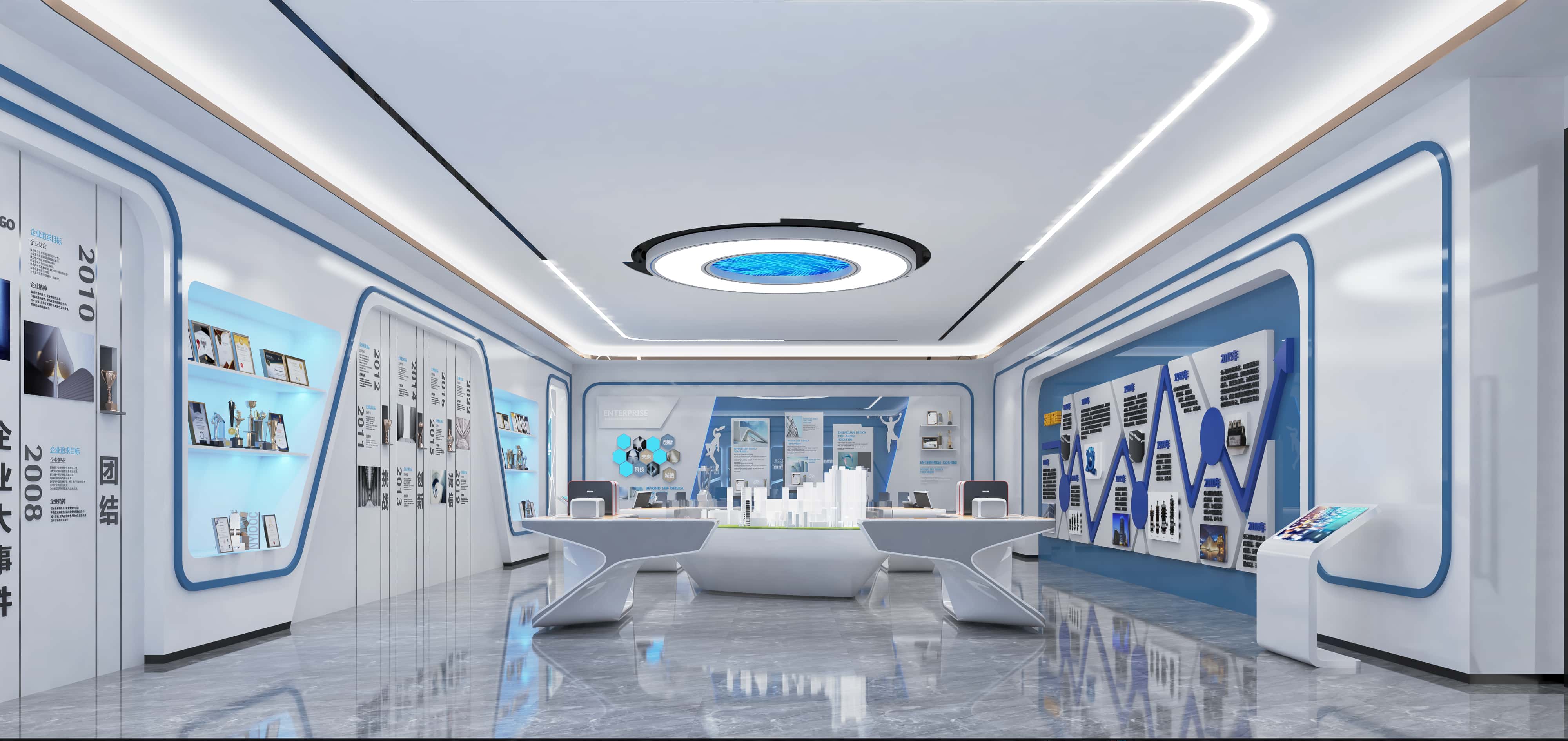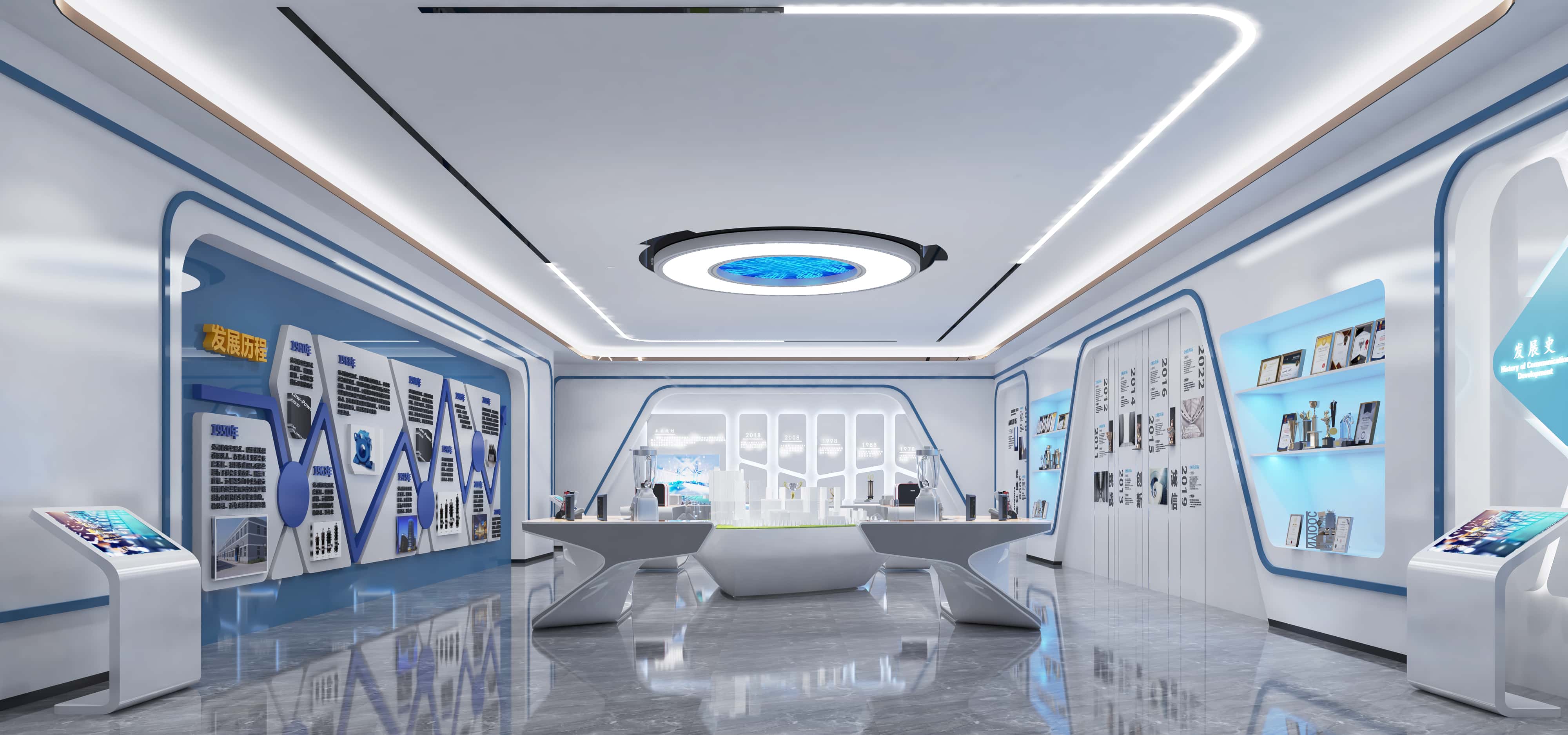 展廳區(qū)域,藍白配色凸顯科技感,弧形墻面結合燈帶,造型獨特。展示墻系統(tǒng)呈現企業(yè)歷程與榮譽,多媒體設備增強互動,展示臺設計新穎,燈光烘托氛圍,打造出一個集展示與體驗于一體的現代空間。