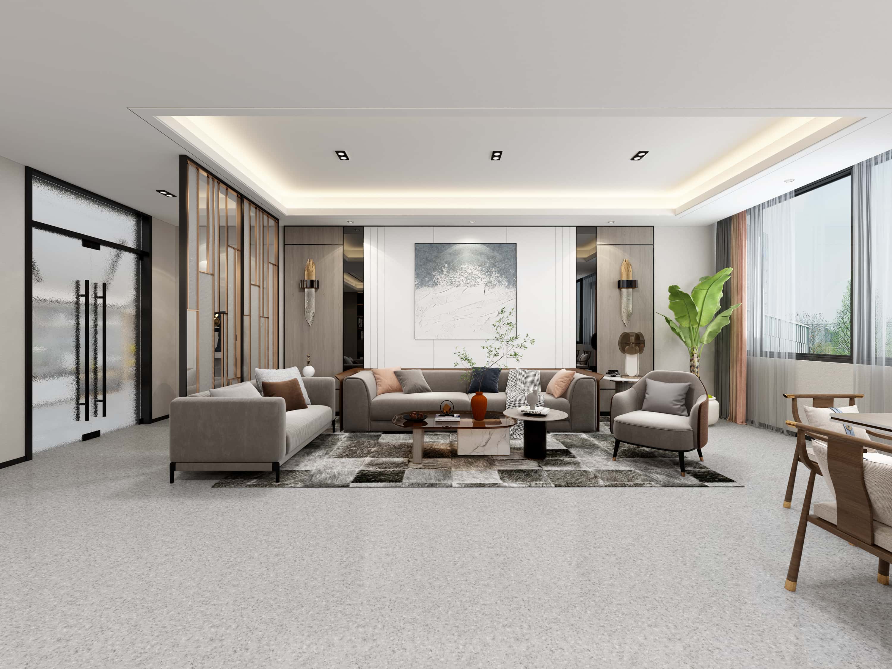 接待室,淺灰地毯搭配柔和燈光,營(yíng)造舒適氛圍,沙發(fā)、茶幾等家具擺放錯(cuò)落有致,藝術(shù)畫(huà)作提升空間格調(diào)。