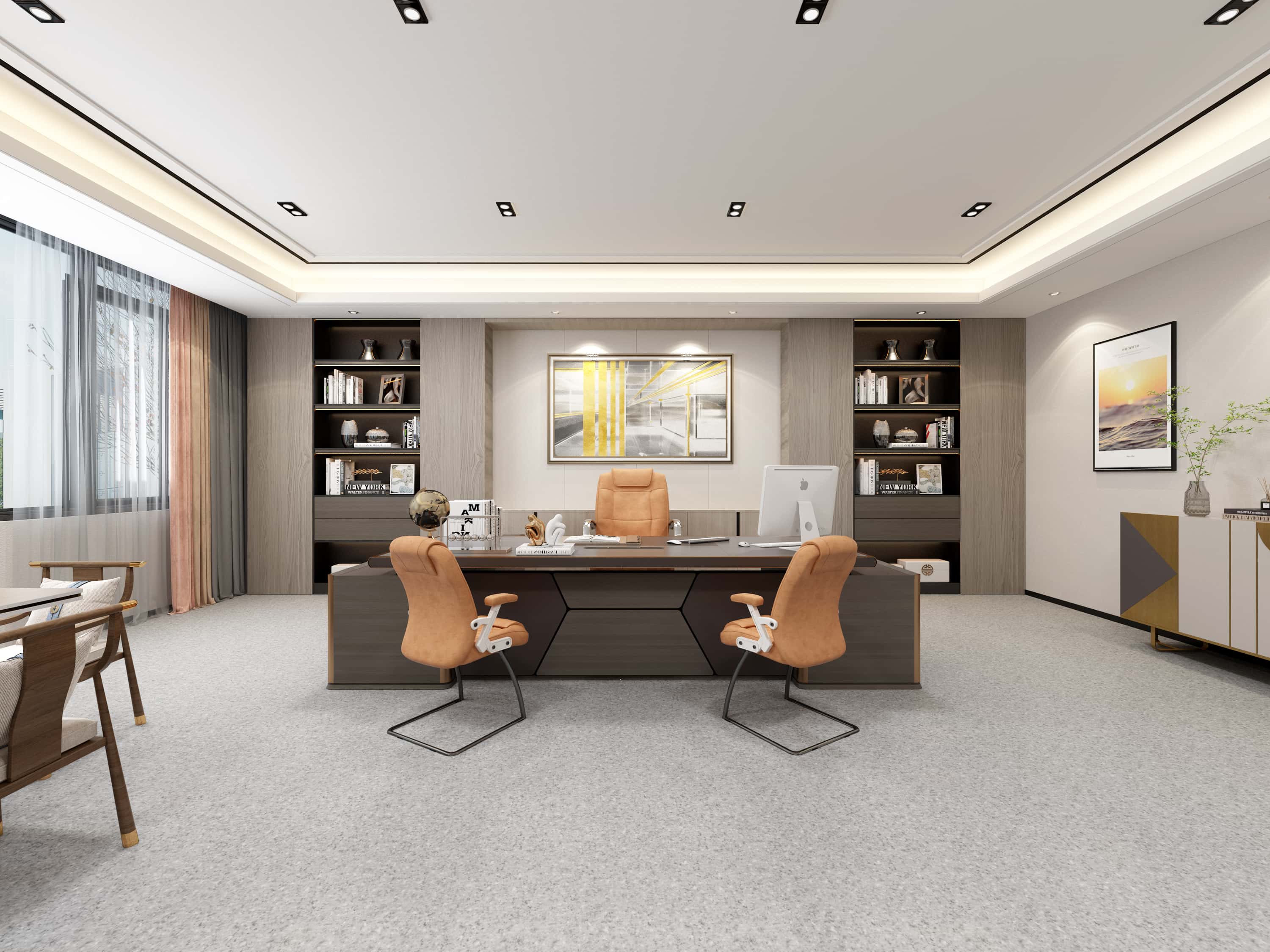 經(jīng)理辦公室,布局合理,辦公桌椅與書(shū)架搭配協(xié)調(diào),裝飾畫(huà)與綠植點(diǎn)綴其間,營(yíng)造出專業(yè)且舒適的辦公環(huán)境。