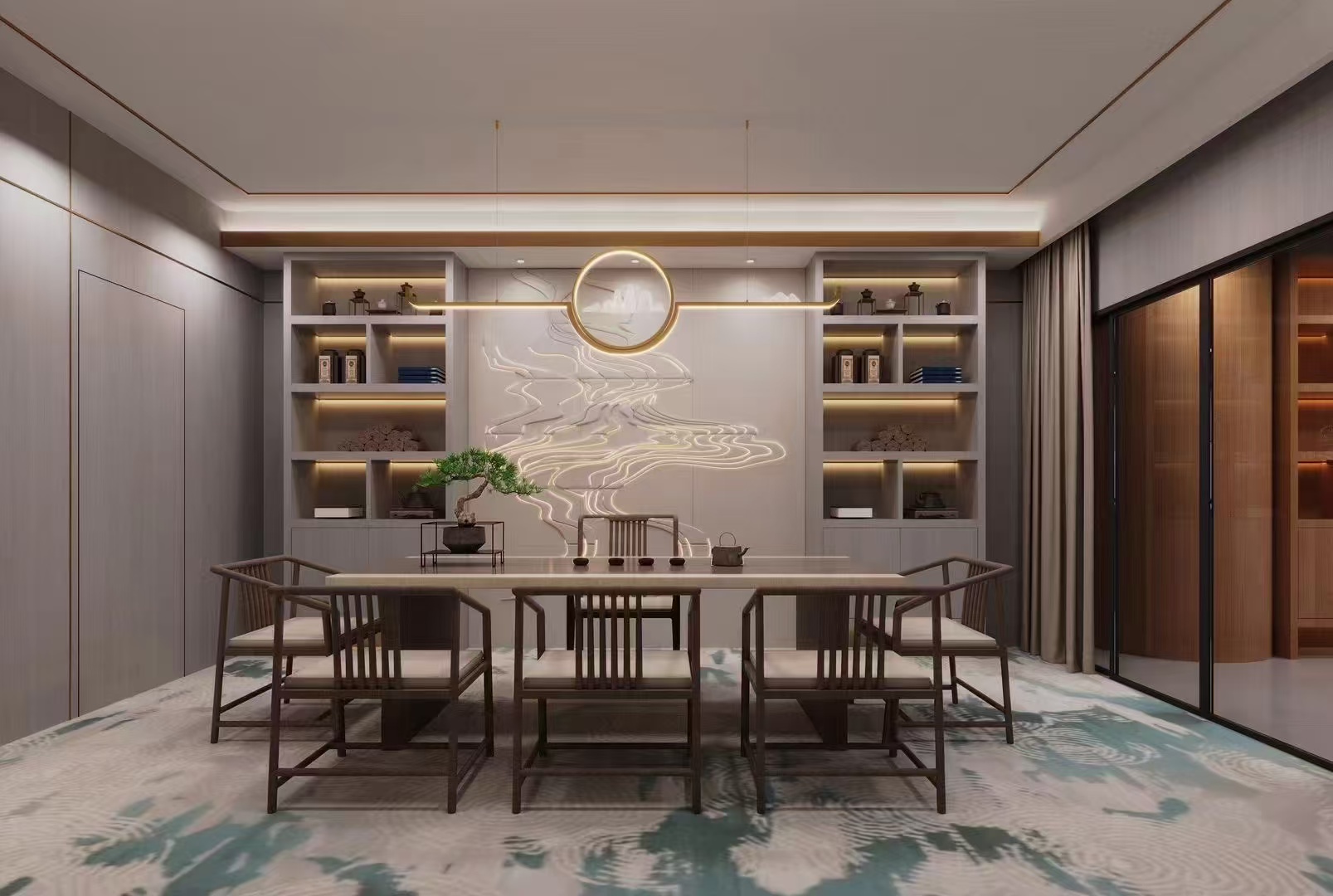 定制的中式桌椅古樸典雅,搭配精致的茶具和小型盆栽,盡顯中式韻味。兩側(cè)的書架上陳列著書籍和擺件,增添了文化氣息。地面鋪設(shè)的地毯圖案與墻面山水線條相呼應(yīng),整體協(xié)調(diào)統(tǒng)一,是一個適合洽談、休憩的雅致空間。