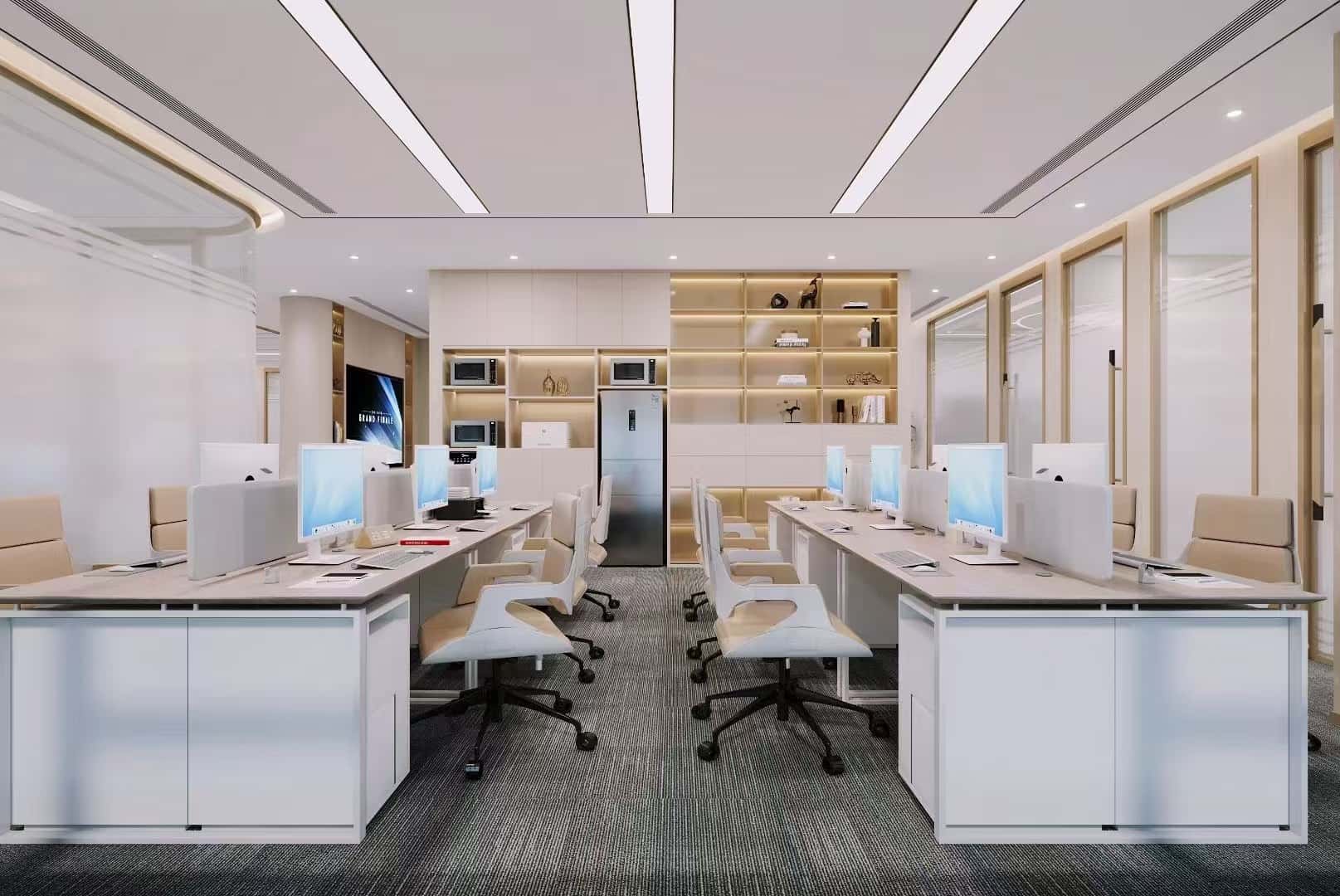 開放式辦公區(qū)布局合理,辦公桌整齊排列,白色的辦公桌搭配米色與白色相間的辦公椅,簡(jiǎn)潔大方且舒適實(shí)用。天花板上的長(zhǎng)條形燈帶設(shè)計(jì),提供了均勻充足的照明,同時(shí)增強(qiáng)了空間的縱深感與現(xiàn)代感。