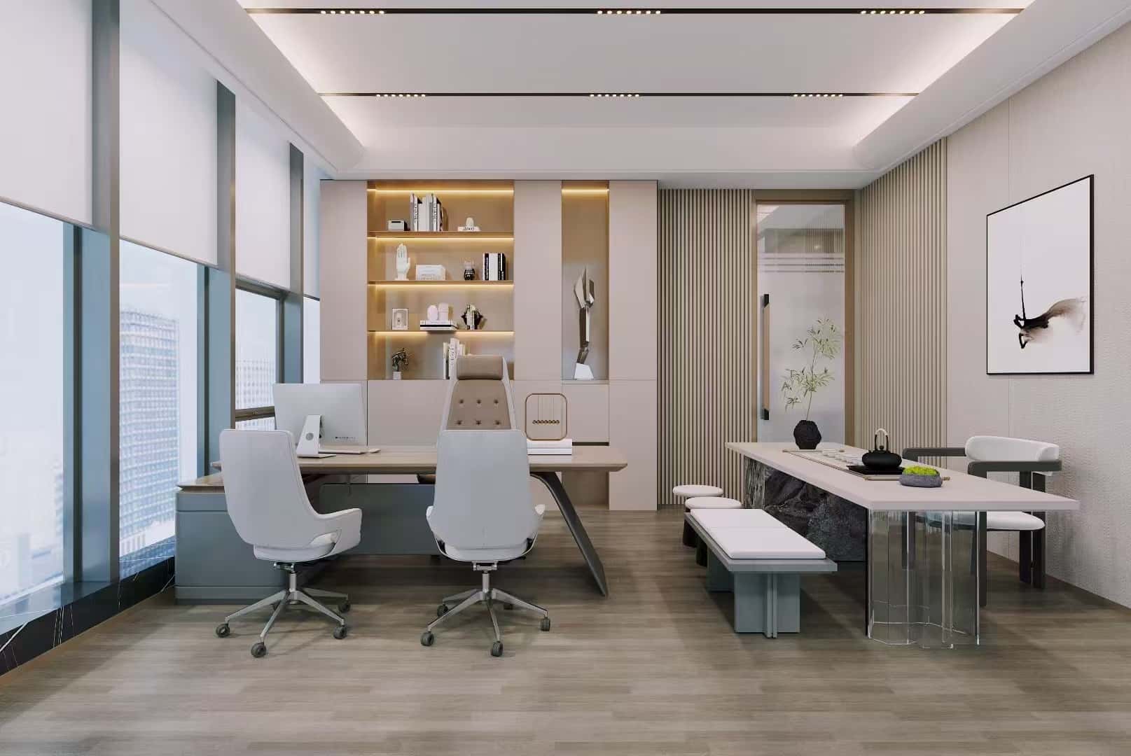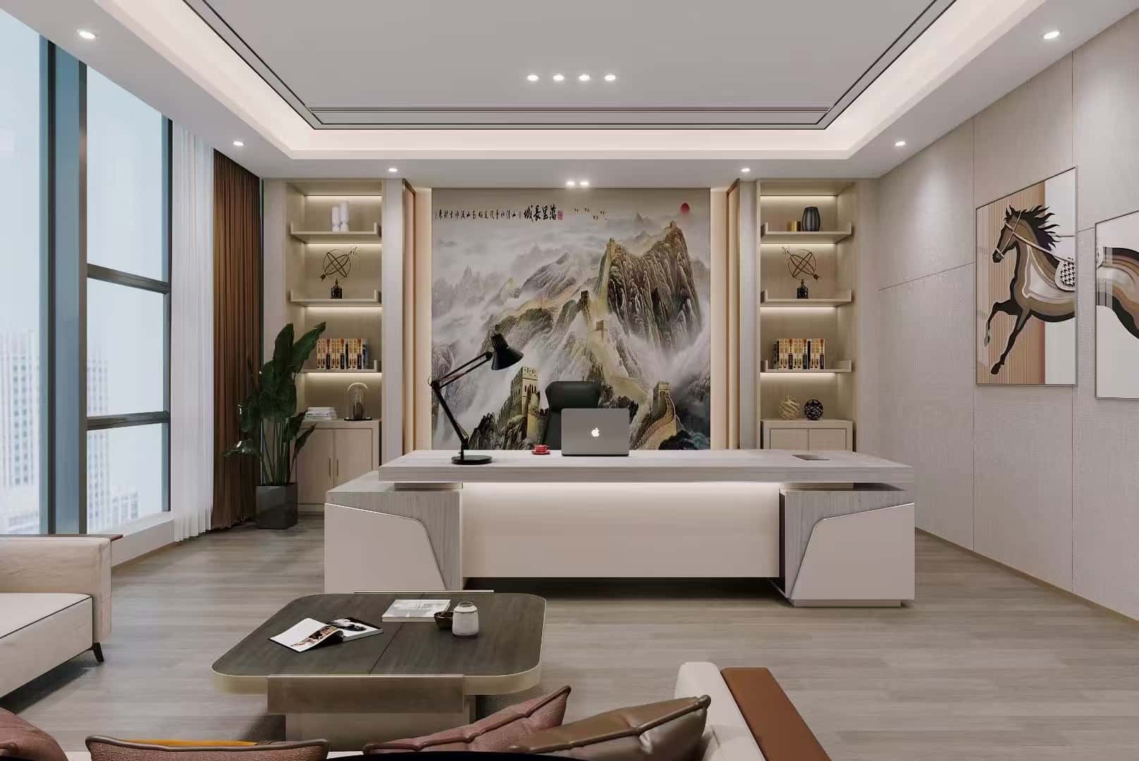 辦公家具選擇簡(jiǎn)約而富有設(shè)計(jì)感的款式,辦公桌、辦公椅及沙發(fā)等家具的顏色搭配和諧,營(yíng)造出舒適的辦公氛圍。書架上擺放的書籍、裝飾品等,豐富了空間的文化內(nèi)涵,展現(xiàn)出企業(yè)的品味與格調(diào)。部分辦公室內(nèi)的背景墻裝飾有大幅山水畫或藝術(shù)畫作,如長(zhǎng)城畫作、駿馬畫作等,增添了藝術(shù)氣息與文化底蘊(yùn),體現(xiàn)了領(lǐng)導(dǎo)的品味與企業(yè)的文化內(nèi)涵。