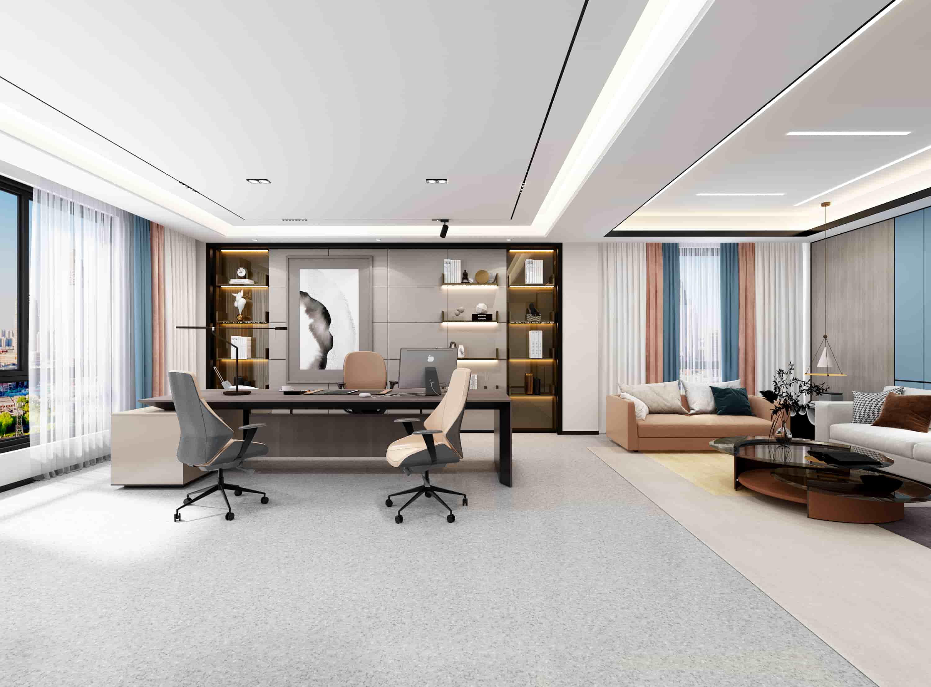 該辦公室延續(xù)了現(xiàn)代簡(jiǎn)約的風(fēng)格,色調(diào)以米色、灰色和棕色為主,營(yíng)造出溫馨舒適的辦公環(huán)境。辦公桌同樣簡(jiǎn)約大方,搭配舒適的辦公椅,滿足日常辦公需求。