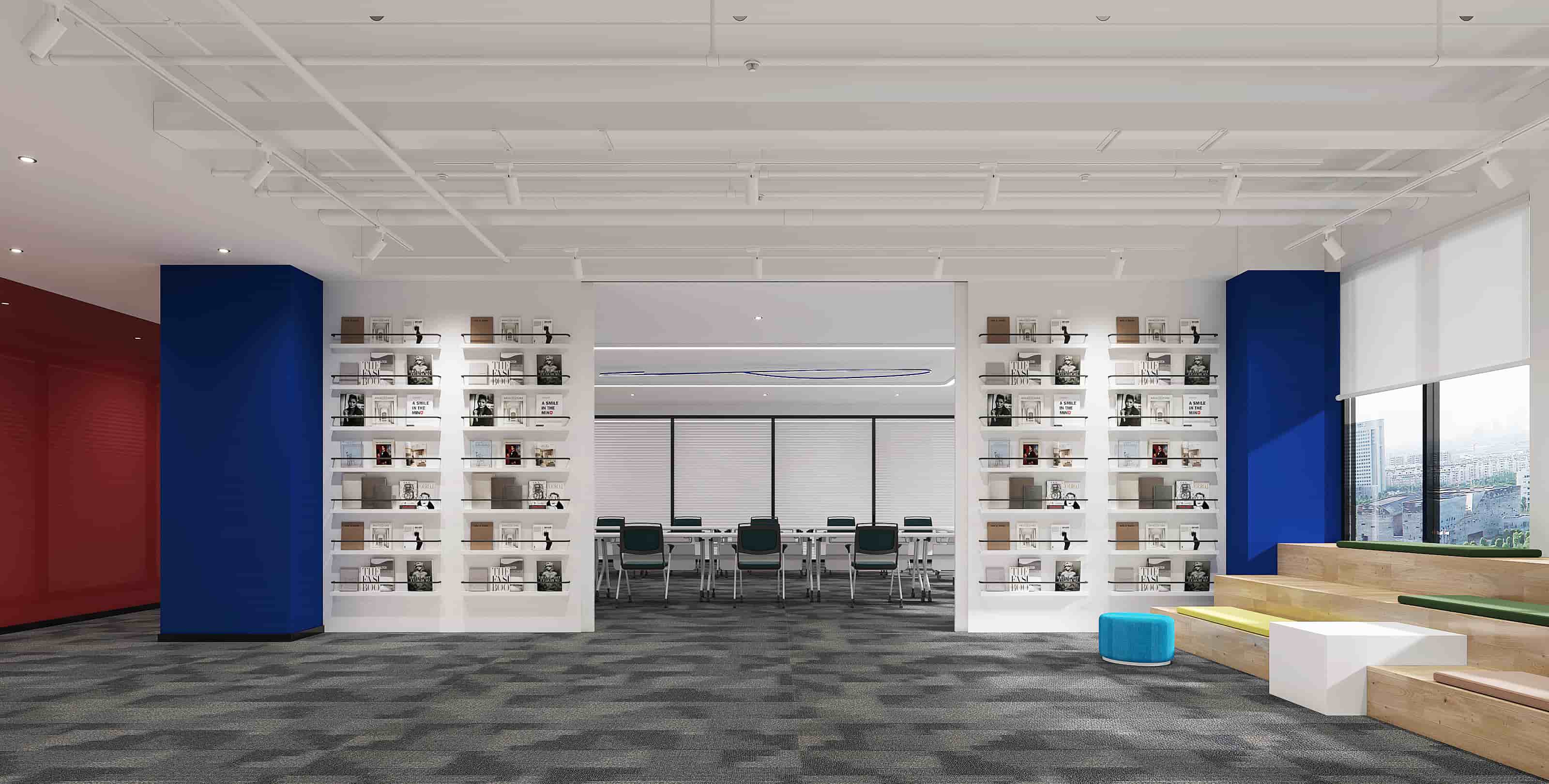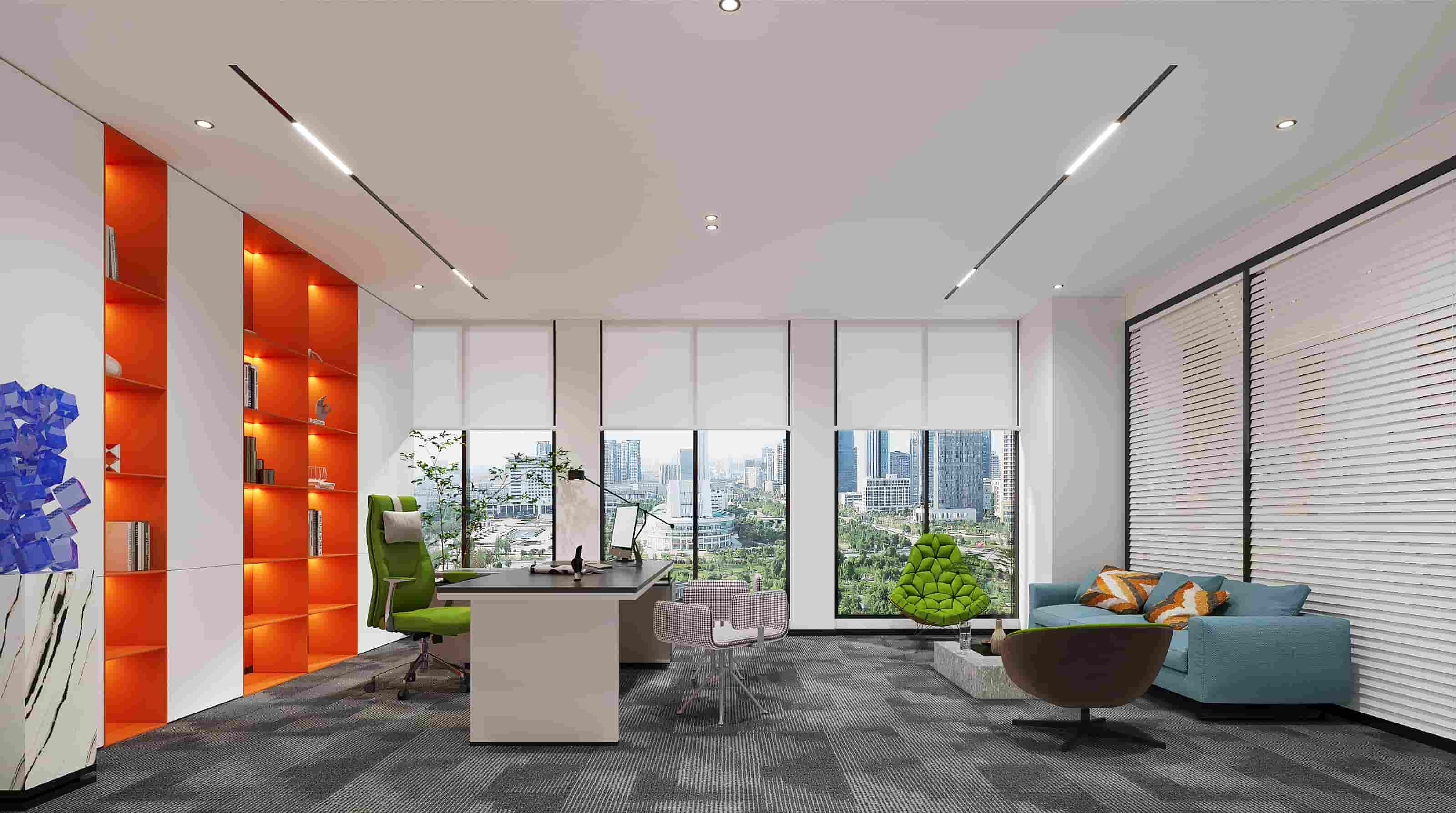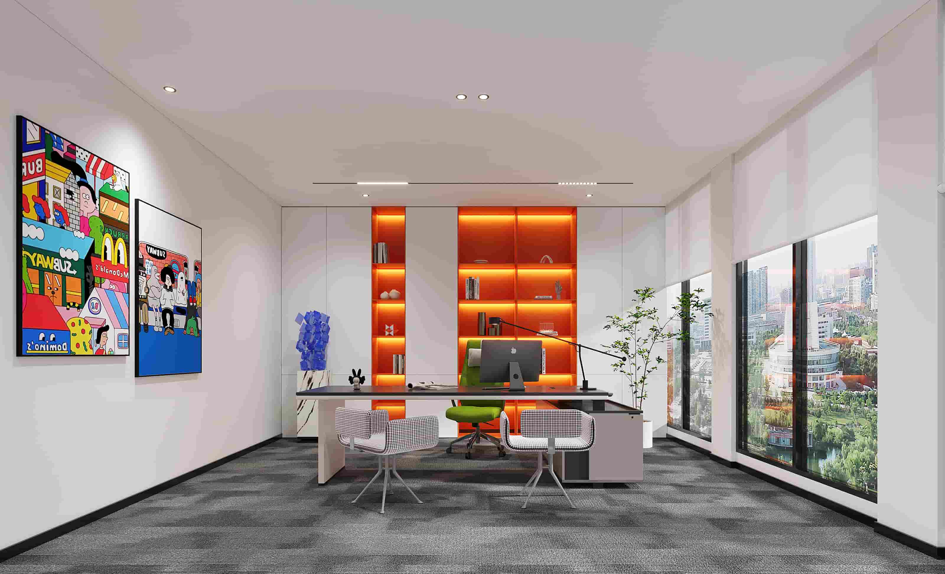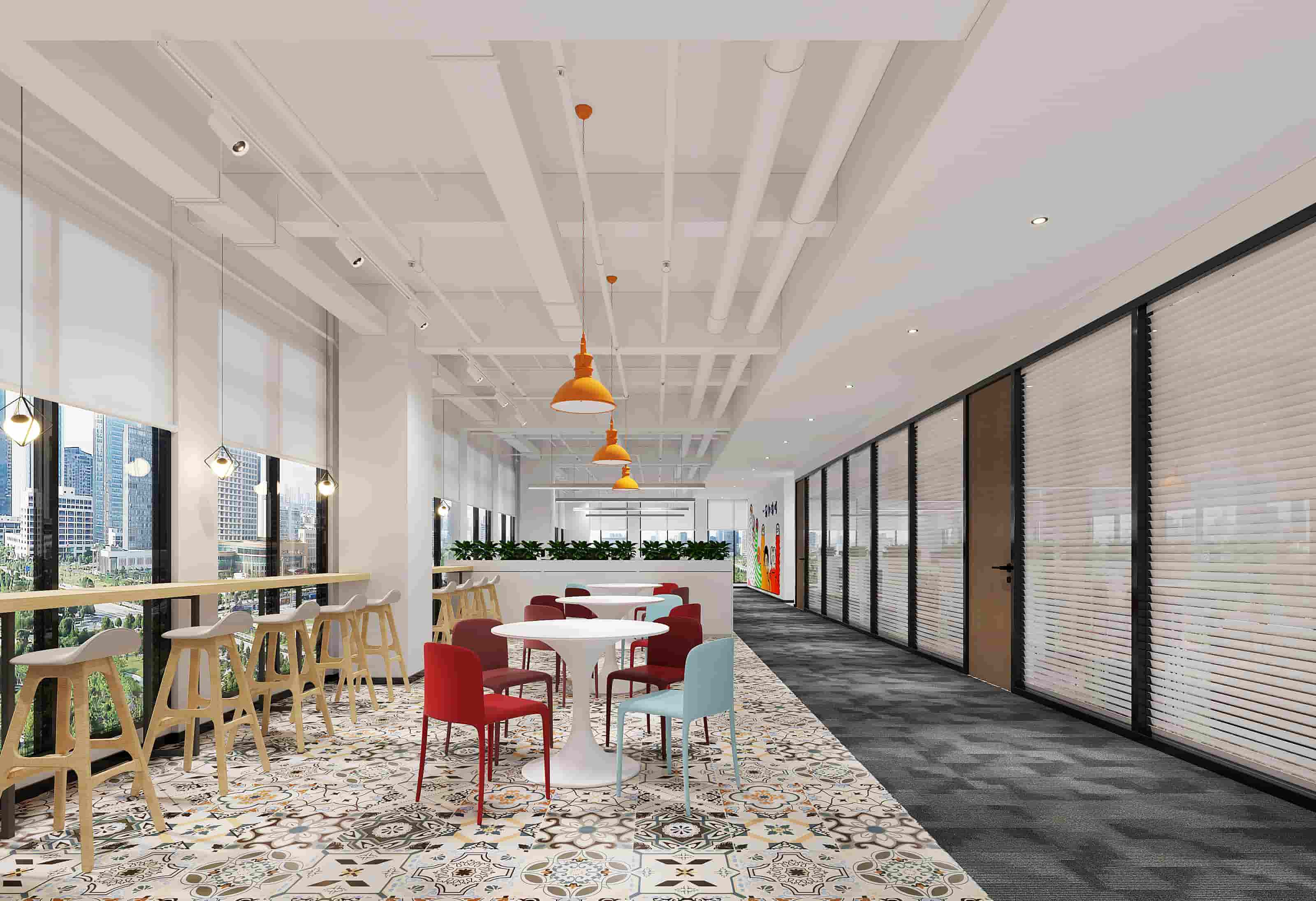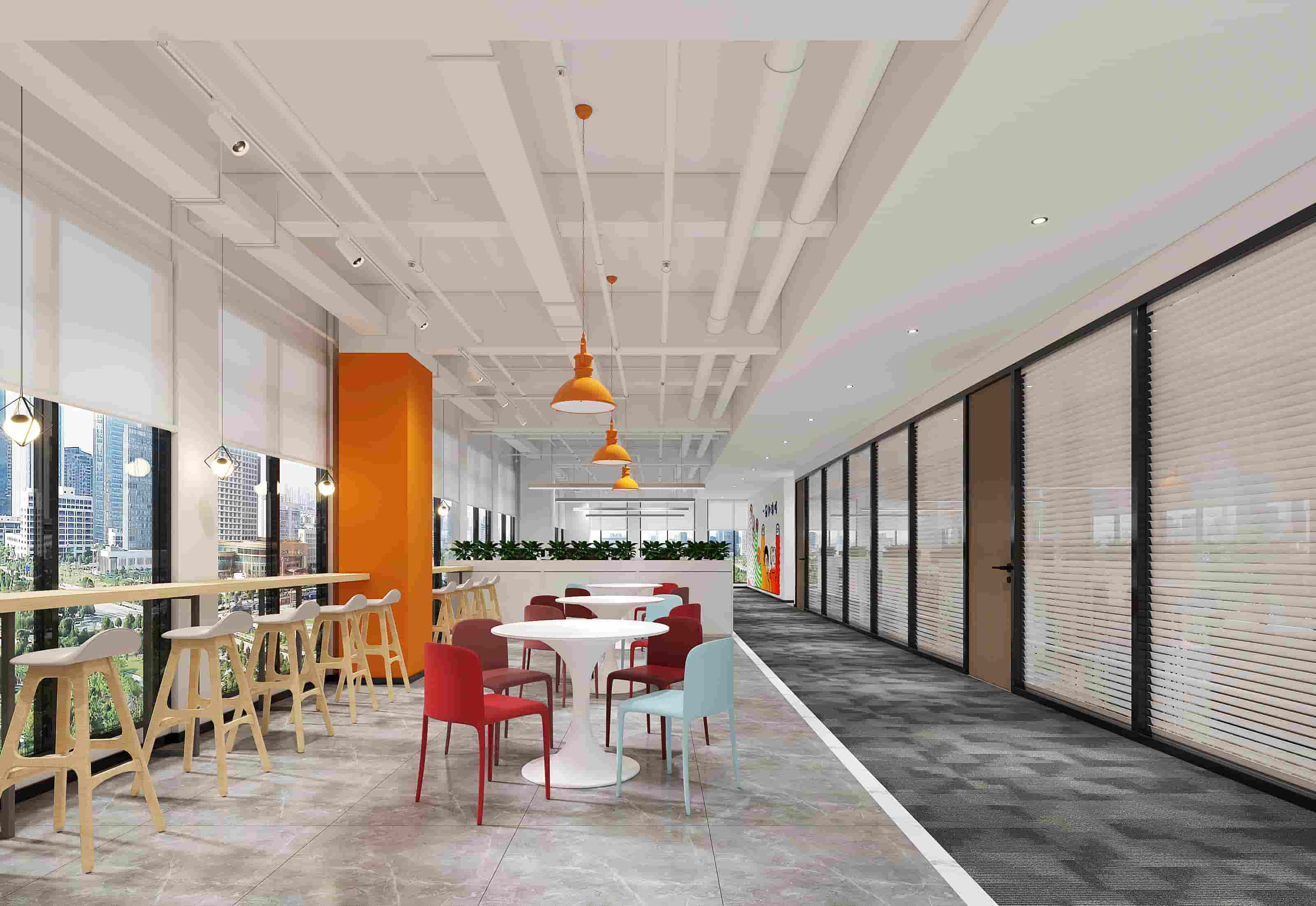 休閑區(qū)以白色為主調(diào),搭配橙色立柱與多彩家具,營造輕松氛圍,落地窗引入充足光線,窗外景色宜人。會議室兩側(cè)書架陳列書籍,增添文化氣息,藍(lán)色立柱與紅色墻面形成視覺沖擊。階梯區(qū)木質(zhì)階梯結(jié)合彩色坐墊,背景墻的城市景觀壁畫別具一格。辦公室內(nèi)色彩鮮艷的裝飾與簡潔的辦公家具相得益彰,綠植點(diǎn)綴生機(jī)。各處燈光設(shè)計柔和,照亮空間同時提升舒適度,旨在打造一個功能多樣、舒適且充滿創(chuàng)意的辦公環(huán)境。